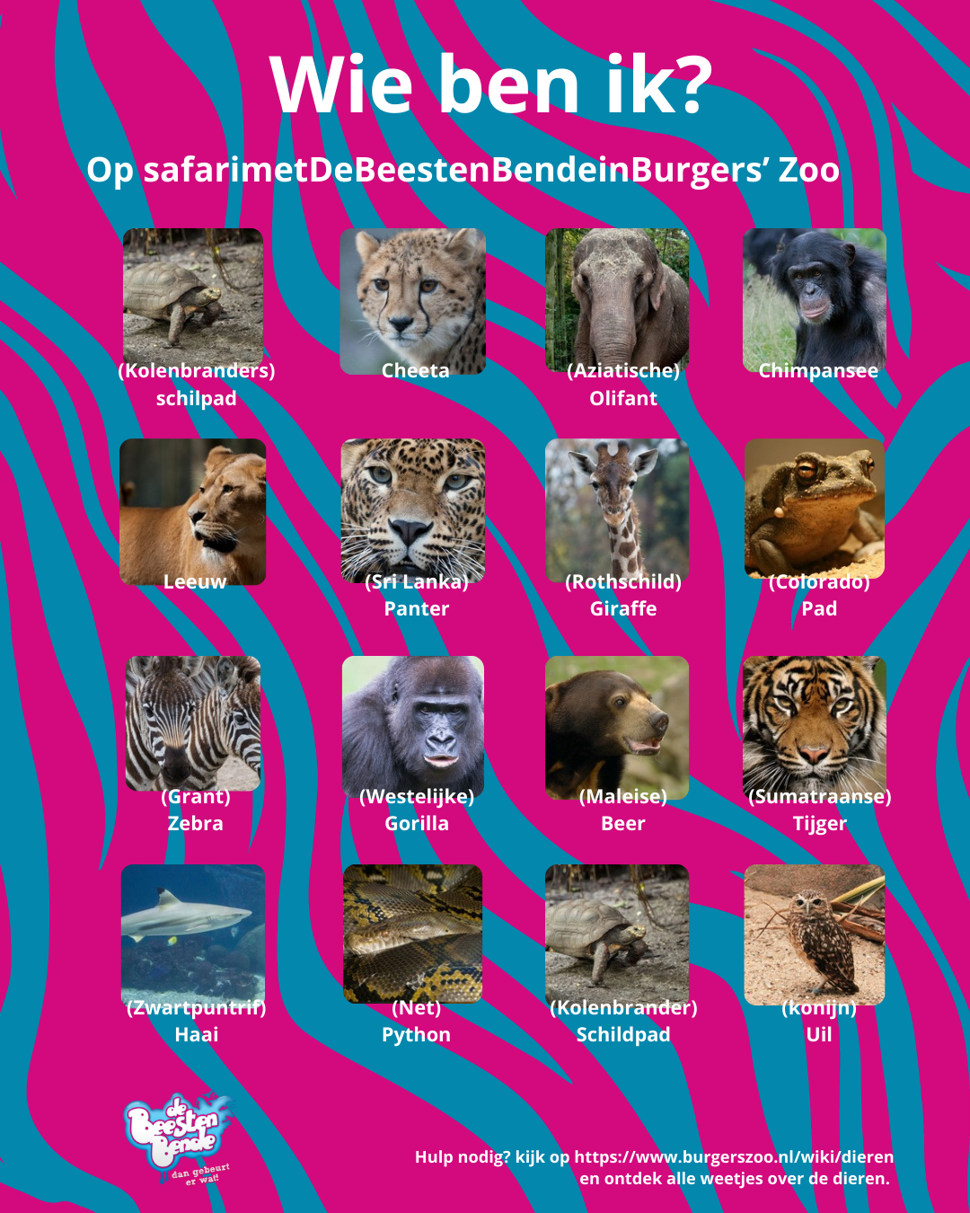 Nog maar even en dan is het zover: De Grote BeestenBende Dag in Burgers’ Zoo! Wij kunnen niet wachten om samen met jullie dit bijzondere avontuur te beleven. Om alvast in de stemming te komen, hebben we iets leuks bedacht: speel de BeestenBende “Wie ben ik?” Raad welk dier je bent door slimme vragen te stellen. Ben je een roofdier of een prooidier? Leef je in het water of op het land? Zo kom je stap voor stap dichter bij jouw dierlijke identiteit. Download het spel hier de Wie ben ik? en daag je familie, vrienden of BeestenBende-team uit. Perfect om alvast helemaal in de Burgers’ Zoo sfeer te komen! En wil je nóg meer dieren ontdekken? Neem dan alvast een kijkje op de website van Burgers’ Zoo. Daar vind je volop inspiratie en kom je alles te weten over de bijzondere dieren die we straks samen gaan ontmoeten. We tellen samen met jullie af. Tot snel in de dierentuin!